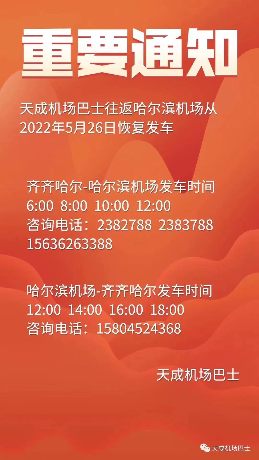 黑龍江天成運(yùn)業(yè)集團(tuán)齊齊哈爾客運(yùn)有限公司機(jī)場(chǎng)巴士往返于齊齊哈爾與哈爾濱太平國(guó)際機(jī)場(chǎng)間,全程運(yùn)行約3小時(shí)50分鐘。行程360公里,中途在大慶紅湖服務(wù)區(qū)???分鐘,大慶機(jī)場(chǎng)可上下。